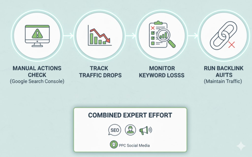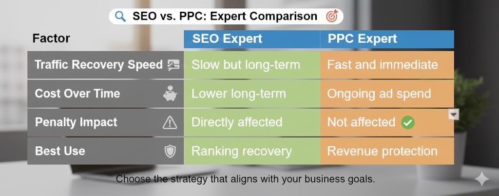 A full-service digital marketing agency provides additional support through paid ads and social media marketing. While SEO recovery takes time, PPC experts help maintain traffic and sales, and Social media experts keep the brand visible.