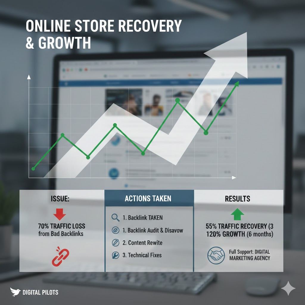 The website lost 70% of its organic traffic due to spammy backlinks and poor content quality.